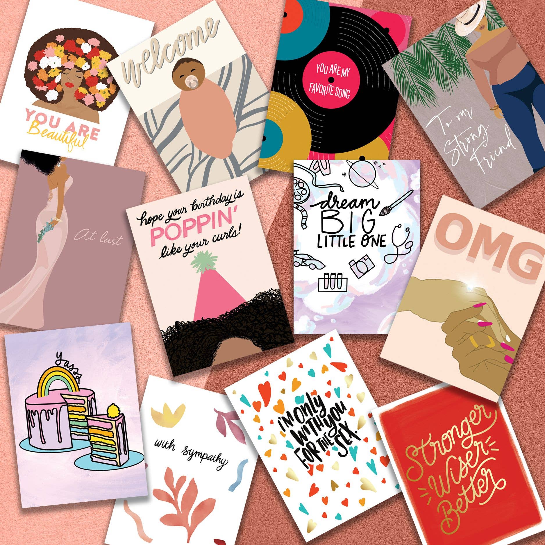 Inside Verse: You deserve everything you want & more. Treatment: Foil. Illustrated by Lauren-Ashley Barnes. 4.6 x 6.4. Printed in the USA on high-quality post-consumer waste recycled paper. Card has colorful inside touches.