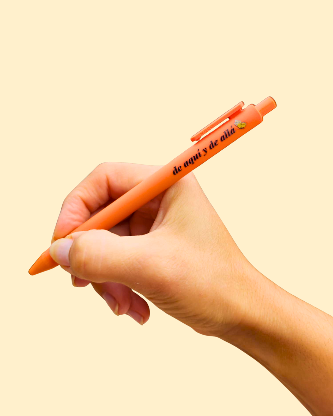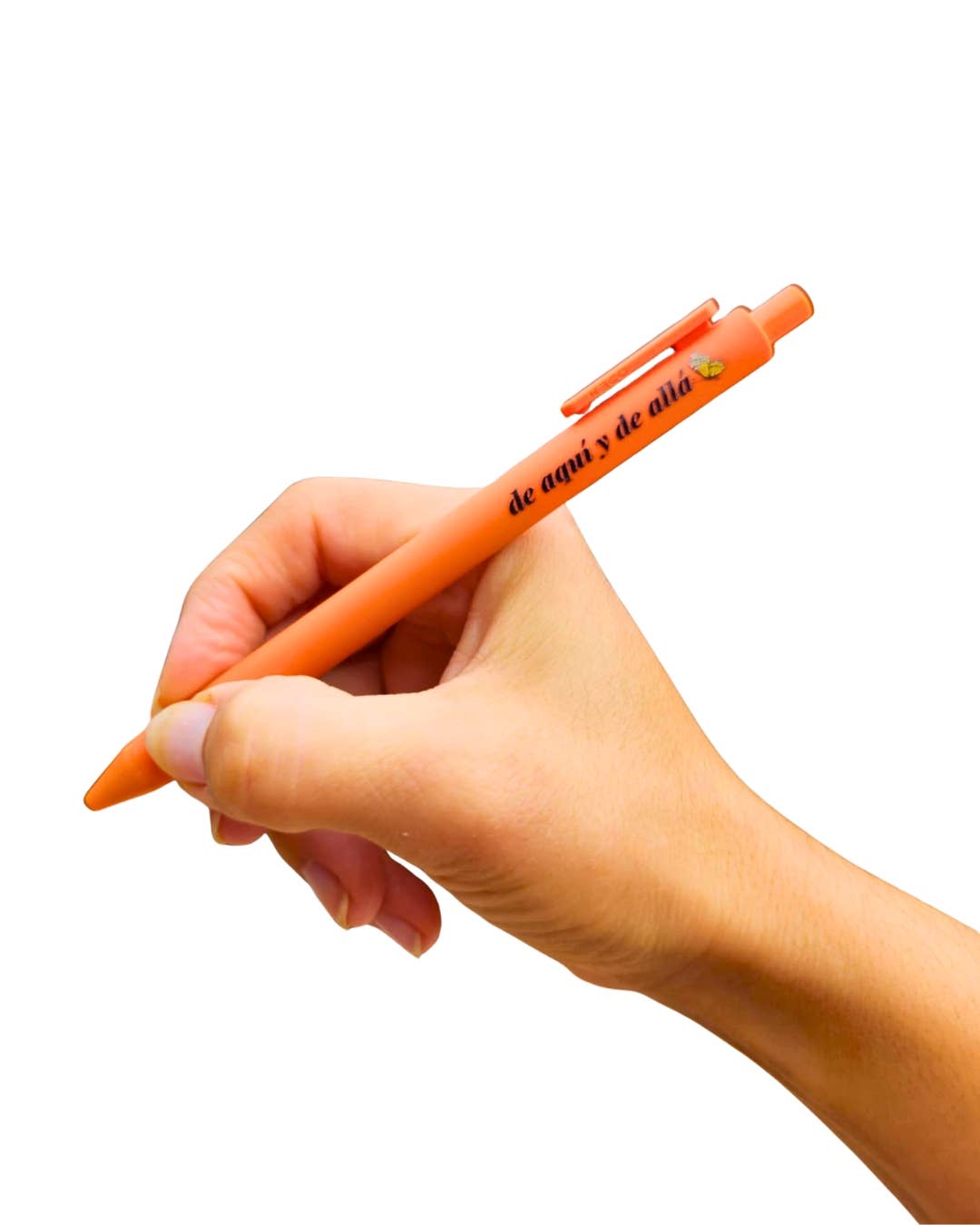 This is your new favorite pen! A soft touch surface with a fine point gel tip. Orange barrel reads "de aquí y de allá" which translates to "from here and from there." A message of belonging and resilience to immigrant communities. Writes in black ink.