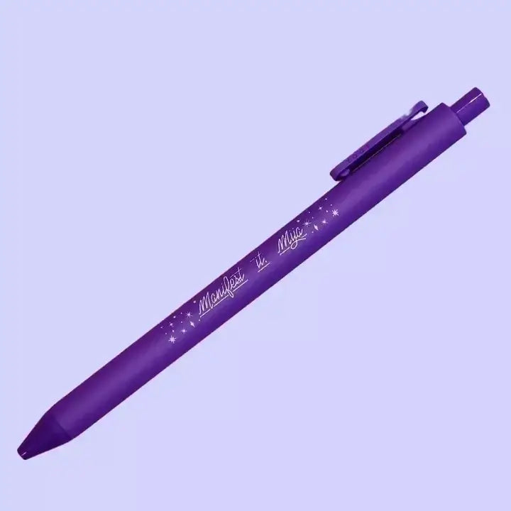 This is your new favorite pen! A soft touch surface with a fine point gel tip. Purple barrel reads Manifest it, Mija to keep you working your magic. Writes in black ink.