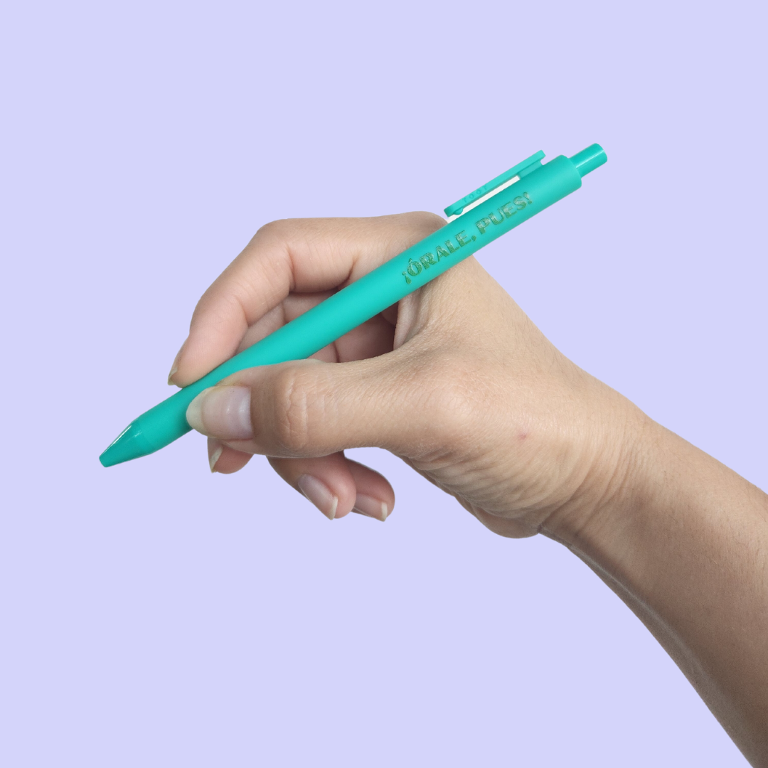 This is your new favorite pen! A soft touch surface with a fine point gel tip. Turquoise barrel reads "¡Órale, pues!" which is Spanish slang that translates to “Alright then!” or “Let’s go then!” Writes in black ink.
